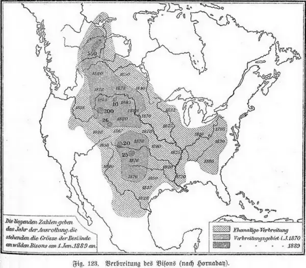 В результате хищнического истребления численность бизонов к началу XX века снизилась с нескольких десятков миллионов до нескольких сотен. Французский биолог Жан Дорст (Jean Dorst) отмечал, что первоначально общая численность бизонов составляла примерно 75 миллионов, но уже в 1880—1885 годах в рассказах охотников Севера США говорилось об охоте на «последнего» бизона. В период 1870 по 1875 год ежегодно убивали примерно 2,5 миллиона бизонов. Историк Эндрю Айзенберг писал о снижении численности бизонов с 30 миллионов в 1800 году до менее тысячи к концу века.