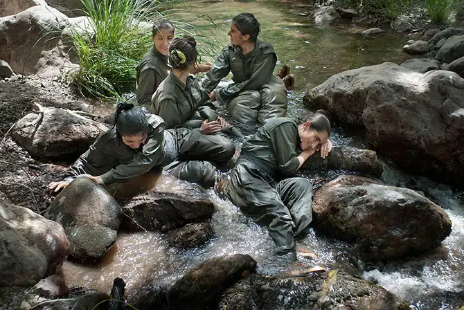 На этой базе женщины-бойцы, принадлежащие самым разным слоям общества и имеющие гражданство разных стран, проходят военную и идеологическую подготовку. Все бойцы живут в поистине спартанских условиях.