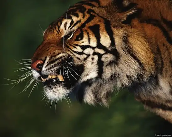 7. Обычно тигры не рычат на других животных, но могут с помощью рёва общаться с другими тиграми издалека. Если тигр собирается нападать, он не рычит, а фыркает и шипит.