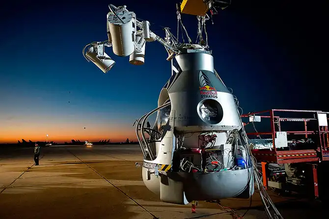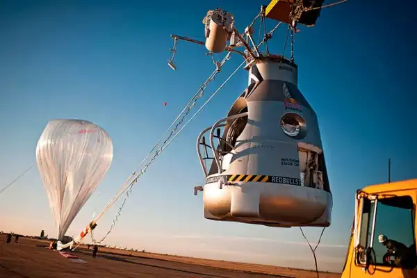 В стратосферу капсулу с парашютистом поднял огромный шар, наполненным гелием, высотой в 168 метров. Площадь поверхности материала, из которого был изготовлен шар, была равна почти 15 футбольным полям.