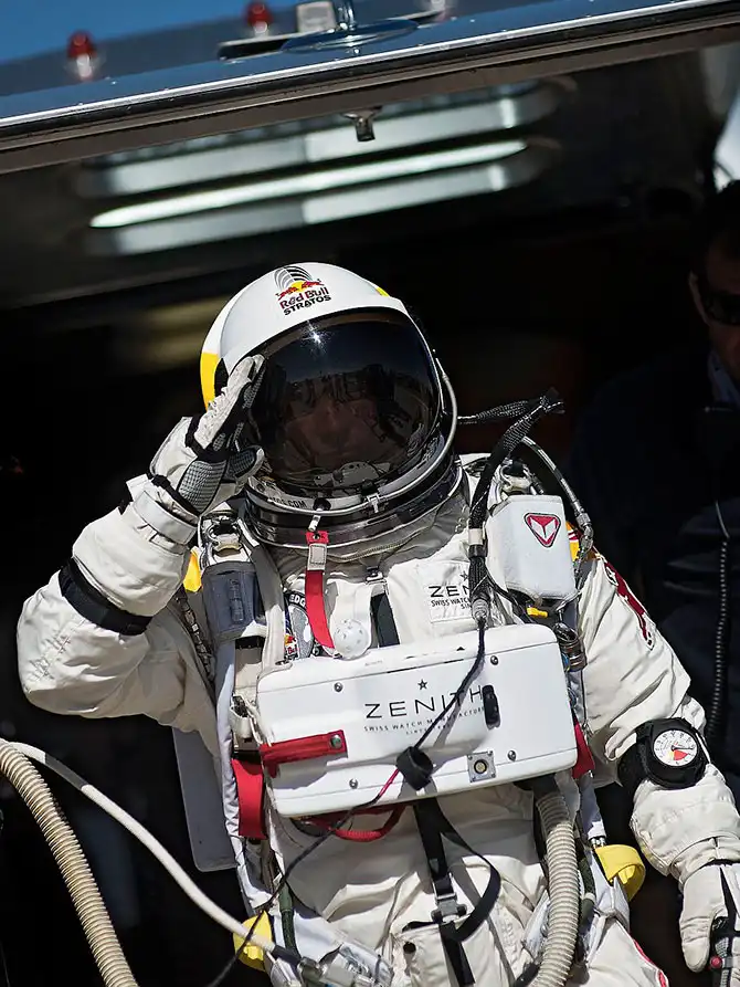 В свободном полете на Баумгартнере был надет защитный скафандр.