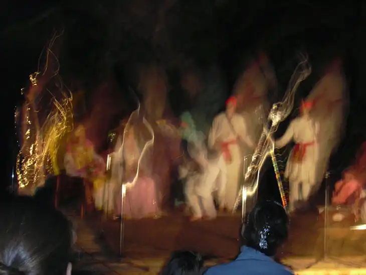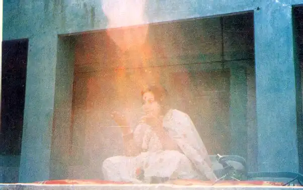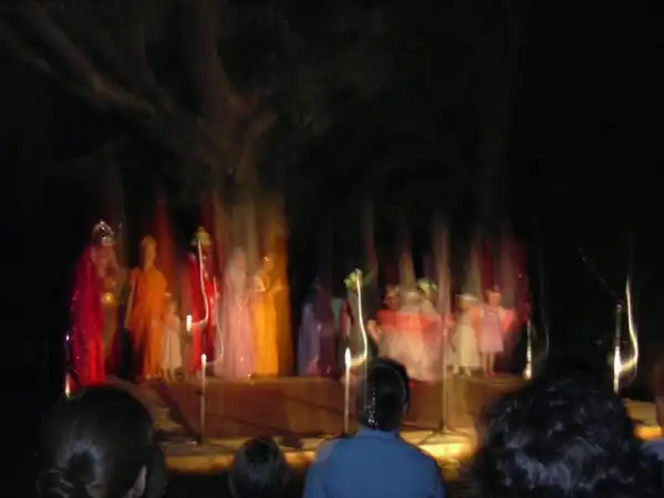 Следующие два снимка сделаны 5 августа 2004 года во время слета российских сахаджа йогов в Подмосковье. Фотографии сделаны вечером, после захода солнца (поэтому такой темный фон - сцена была установлена на открытом воздухе) обычным фотоаппаратом во время театрализованного представления по мотивам древних восточных легенд. Как видно на фотографиях, мощности вспышки хватило на несколько метров от фотографирующего, т.е. хорошо освещены люди, сидящие близко к объективу. Кстати, можно заметить, что эти люди получились четко, с хорошей резкостью, чего не скажешь о фигурах на сцене. Это как раз указывает на эффект "марева" тонких энергий.