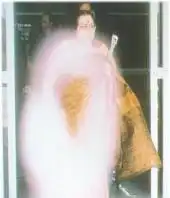 А вот еще один любопытный снимок. Эта фотография сделана 30 октября 2004 года в Лос-Анджелесе, США, во время очередного слета сахаджа йогов. Фигуры на заднем плане в "мареве" вибраций скептики могут объяснить движением камеры (фото делалось на ходу, руки дрожали и т.п.). Поэтому посмотрим на фигуру переднего плана в правой части кадра. Это сахаджа йог из Индии. Обратите внимание, что сам он получился вполне четко, с хорошей резкостью, при этом явственно видны золотые вибрационные потоки, исходящие от него, особенно из середины лба (это Агия-чакра или "Третий глаз Шивы") и точки между бровями (это Хамса-чакра).