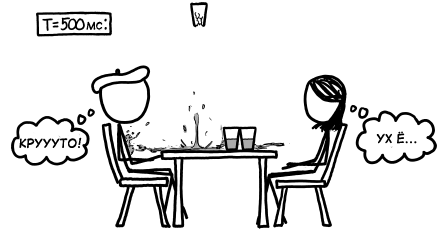 Через полсекунды, наблюдатели, услышав хлопок, вздрогнули. Их головы непроизвольно следуют за взлетающим стаканом.