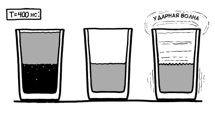 Действие ударной волны от вакуумного коллапса будет продолжаться около миллисекунды, чего будет достаточно чтобы распространиться на другие два стакана. Стакан и вода слегка прогибаются по мере того, как волна проходит сквозь них. Ещё через пару миллисекунд она достигнет человеческого уха и мы услышим громкий хлопок.