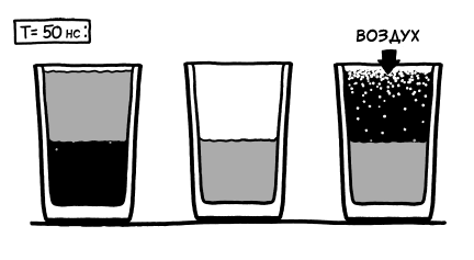 Посередине традиционный стакан с воздухом и водой. Справа стакан подобный обычному, только вместо воздуха - вакуум. Стакан слева наполовину полон водой и наполовину пуст, но пуста нижняя часть.