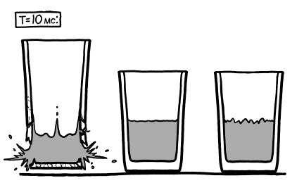 Тем не менее, стакан и вода сейчас двигаются слишком быстро для образования пара. Менее чем через 10 миллисекунд после начала отсчёта, они летят навстречу друг друга со скоростью в пару метров в секунду. Без воздушной амортизации между ними, ведь там только пара капелек водяного пара, вода ударяется в дно стакана как молот.