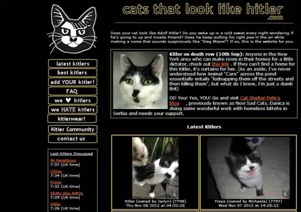 Котики. Странных сайтов про котиков очень много. Есть, к примеру, известное хранилище фотографий котов, которые похожи на Гитлера — www.catsthatlooklikehitler.com.