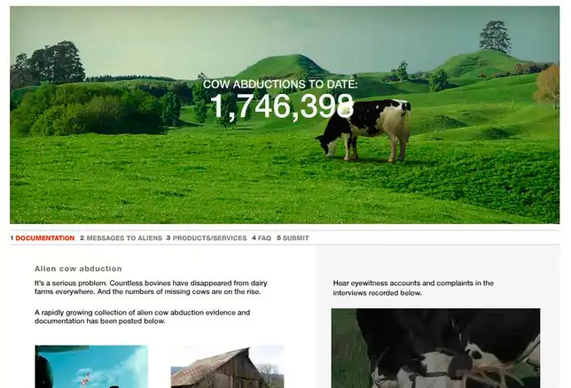 Важная социальная проблема затронута на сайте www.cowabduction.com. Все вы знаете, что пришельцы регулярно похищают коров. Так вот ребята собрались и написали обращение к пришельцам, выказав свое негодование. Заодно разместив на сайте видео- и фото-материалы, документирующие факт похищений, а также предоставив возможность пользователям, так сказать, подпнуть коровку.