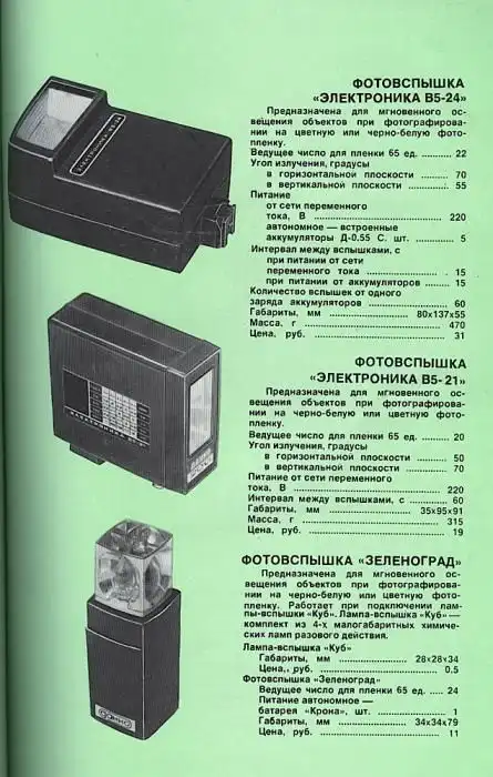 Каталог любопытен еще и наличием цен. Попробуем перевести в более понятные цифры для тех, кто не застал советской эпохи. Средняя зарплата в Москве нынче официально больше 40 000 рублей. В СССР в то время она была примерно рублей 150. Вот из этого и будем исходить. Например, цена этих вспышек получается примерно 8, 5 и 3 тысячи рублей по нынешним меркам.