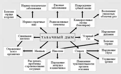 Биологические исследования табачного дыма в целом показали, что большинство генотоксических и канцерогенных веществ находятся в твердой фазе, т. е. в виде частиц. Вещества же, содержащиеся в газообразной фазе, ответственны за раздражение дыхательных путей, приводящее к хроническим неспецифическим воспалительным заболеваниям верхних дыхательных путей и легких. Кроме того, целый ряд компонентов газообразной фазы обладает общетоксическим действием. Один из наиболее токсичных агентов газообразной фазы табачного дыма — окись углерода (угарный газ). Окись углерода интенсивно связывается с гемоглобином, снижая кислородную емкость крови и приводя, таким образом, к гипоксии тканей организма.
