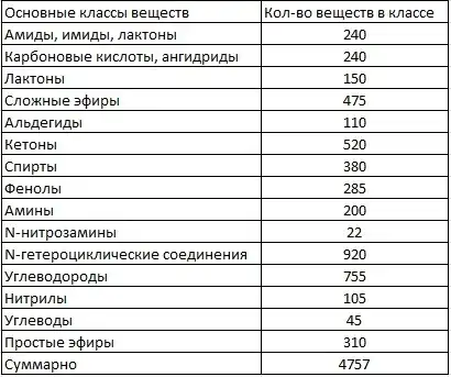 В настоящее время известно около 2500 химических веществ входящих в состав табачного листа, и более 4700 веществ, входящих в состав табачного дыма. Основные классы веществ, входящих в состав табачного дыма с указанием количества индивидуальных веществ в каждом классе представлены в таблице.