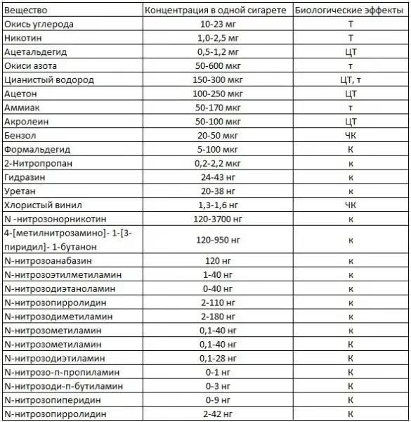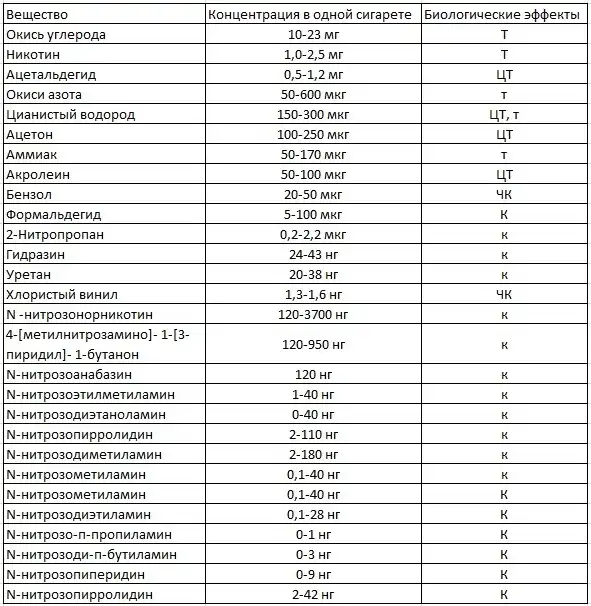 В таблице приведены основные токсические и опухолеродные вещества, содержащиеся в газообразной (парообразной) фазе свежесгенерированного табачного дыма от сигареты без фильтра.