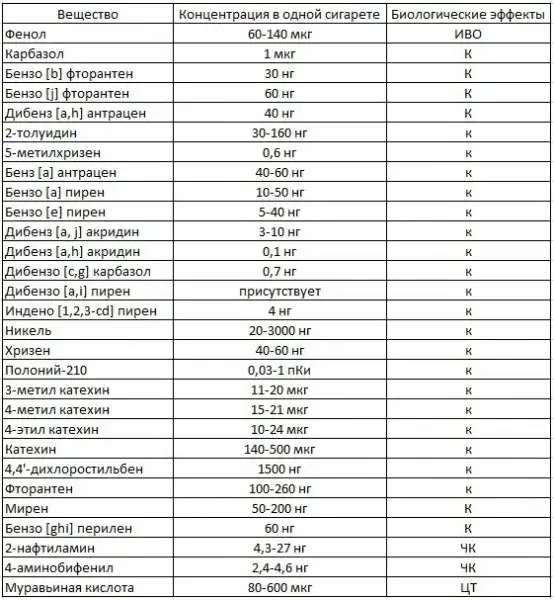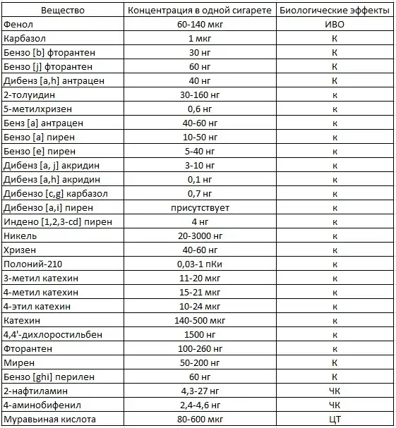 В таблице приведены основные токсические и опухолеродные вещества, содержащиеся в твердой фазе свежесгенерированного табачного дыма от сигареты без фильтра.