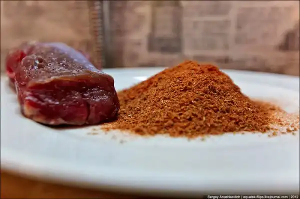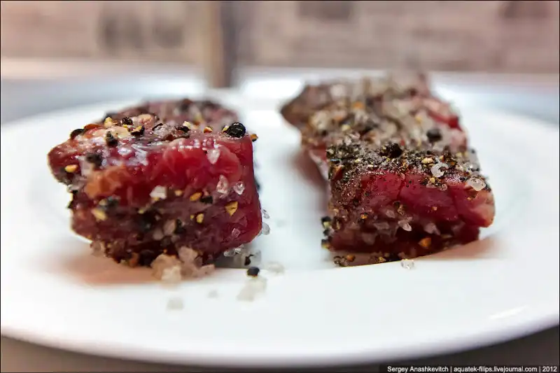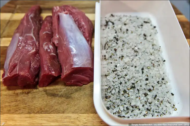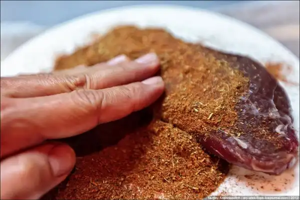 После чего хорошо моем его от соляно-перечной смеси и высушиваем бумажными полотенцами или чистой хлопчатобумажной салфеткой. Важно, чтобы мясо было сухим.