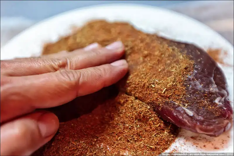 После того, как пряная смесь готова, можно приступать к самому главному - покрывать ею будущую брезаолу