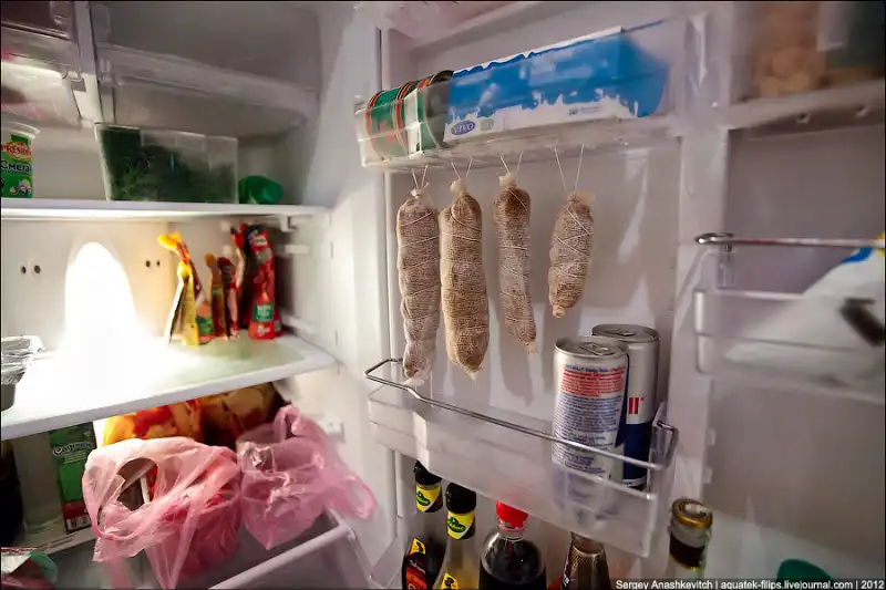После чего подвешиваем брезаолу в холодильнике. Если подвесить мясо возможности нет, можно положить на деревянную досточку, но обязательно нужно регулярно (несколько раз в день) переворачивать тушки мяса в марлевых пеленках.