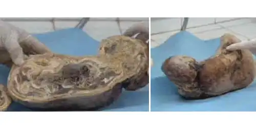 Женщине врачи провели ультразвуковое исследование, на котором обнаружили в теле Зары некое инородное тело, похожее на камень. Было решено незамедлительно проводить операцию, чтобы спасти жизнь женщины. Сложная операция продлилась около 8 часов, и в итоге из чрева Зары было извлечено нечто, отдалённо напоминающее младенца, весом около 3 килограммов и длиной в 42 сантиметра. При более детальном изучении было выявлено, что данный предмет является ребёнком, но каменным.