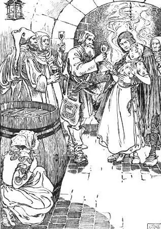 Девушка решила сделать своему жениху сюрприз и по следу из пепла пришла в его крытую соломой избушку, стоящую посреди дремучего леса. Дома жениха не оказалась, а была только сердобольная старуха, сообщившая, что человек, за которого она собралась замуж – убийца-каннибал, питающийся молоденькими женщинами, на которых зачем-то предварительно женится. После этого старушка прячет невесту за большую бочку.