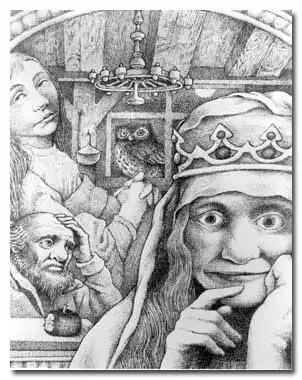 Конечно, женщина открывает запретную дверь, и обнаруживает там тела всех пропавших жён Синей Бороды, которые висят на прибитых к потолку крюках. И в этот самый момент возвращается Борода – по всей видимости, всё время стоял снаружи, прижав ухо к стене и выжидая, когда раздастся характерный скрип несмазанных дверных петель.