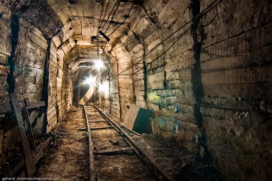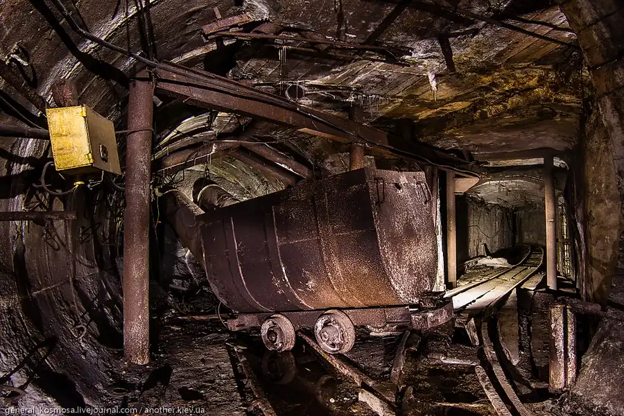 Перевернутая вагонетка на развилке штолен в заброшенном бункере.