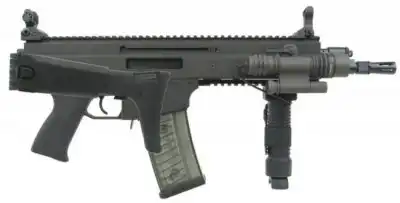 Помимо длинной планки крепления по бокам оружия имеются также более короткие для крепления фонариков, лазерных целеуказателей и прочих устройств. Под стволом оружия также имеется планка крепления для дополнительной рукояти удержания оружия или для подствольного гранатомета. Помимо этого, на эту планку крепления может быть установлено простое пластиковое цевье. Зачем – непонятно. Достаточно интересной особенностью автомата является то, что его магазины не являются стандартными, принятыми в НАТО, однако после замены шахты магазина, которая выполнена отдельной деталью и может быть легко снята после удаления всего одного штифта, оружие становится приспособленным для ведения огня из магазинов от М16.
