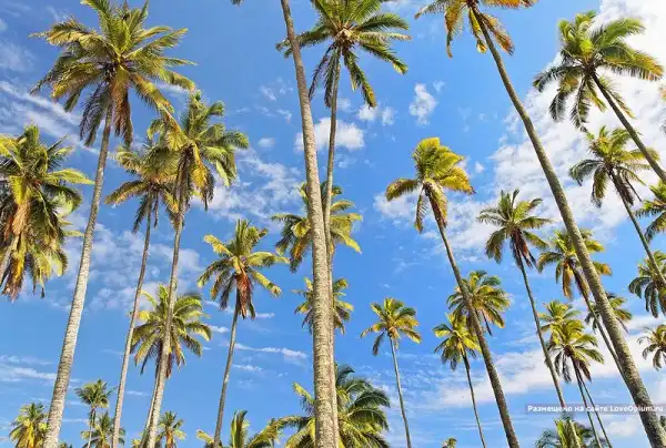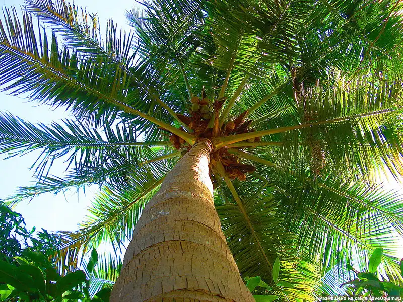 Кокосовая пальмы — высокое дерево (до 27–30 метров). Ствол — 15-45 см в диаметре, листья длиной 3–6 метров:
