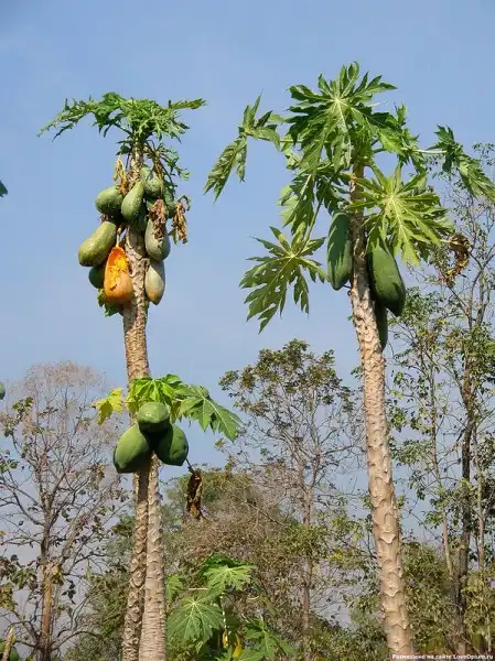 Папайя, или дынное дерево — невысокое стройное дерево с тонким, лишённым ветвей стволом высотой 5–10 метров. Цветки развиваются в пазухах листьев, превращаясь в большие плоды, диаметром 10–30 см и длиной 15–45 см.