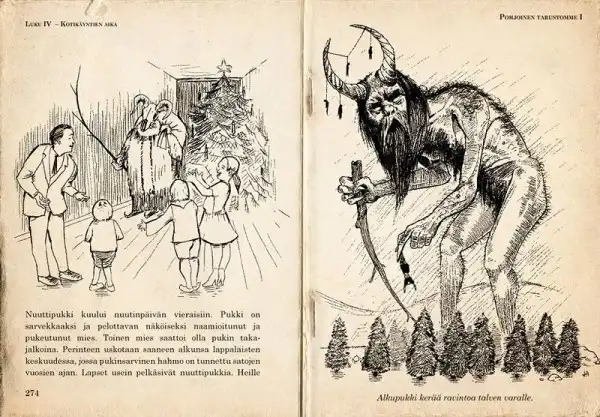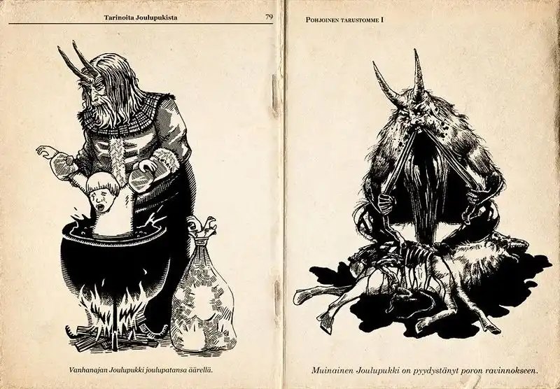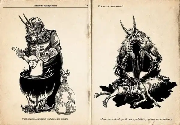 Настоящий Йоулупукки из Лапландии не имеет ничего общего с веселым бородатым дедушкой в красном костюме.Йоулупукки, что переводится как "рождественский козел", и он был одним из самых мрачных мифических существ. В XIX веке Санту представляли в виде злобного существа с рогами и козлиной шкурой. В новогоднюю ночь он пытался пробраться в дом, чтобы напугать детей и напиться. Непослушных детишек он варил в котле, а оленей ел, когда жрать больше нечего.