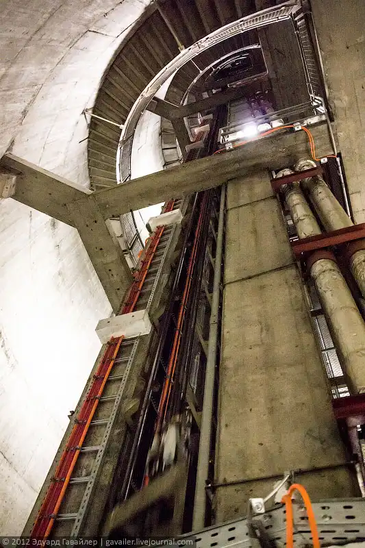 Внутри расположены два лифта, которые транспортируют гостей до смотровой платформы со скоростью 5 м/с. Поднимаемся на один из промежуточных технических этажей.