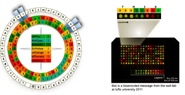 Колонии бактерий наносятся на подложку в виде рядов точек. Каждая пара точек (цветов) является кодом для буквы, цифры или символа. Семь цветов дают 49 комбинаций, авторы работы использовали их для кодирования 26 букв и 23 буквеннно-цифровых символов (таких как @ или $).