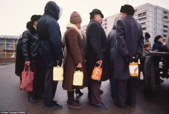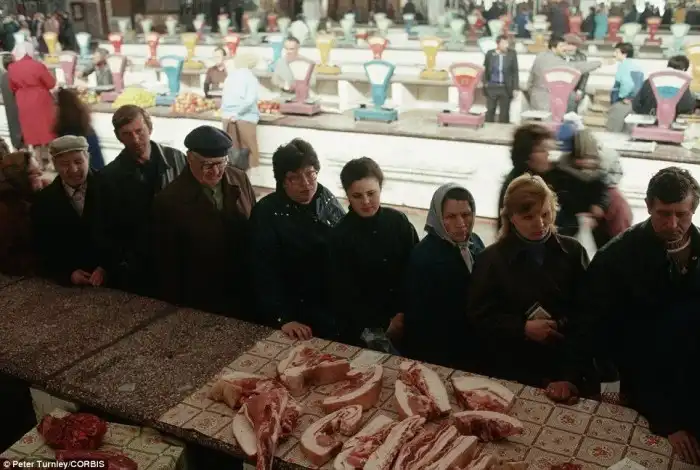 Жуткое состояние экономики в СССР, в то время как уровень жизни на Западе быстро улучшался, явилось результатом коммунистической политической системы, которая задушила свободное предпринимательство и приостановила движение страны из ее феодального прошлого. Как показывают эти фотографии, к 1980-м годам эта система была близка к крушению, как только либеральные реформы Михаила Горбачева всего лишь приоткрыли дверь все более громким призывам к переменам, и 26 декабря 1991, спустя всего лишь несколько лет после того, как сделаны эти снимки, Советский Союз окончательно распался.