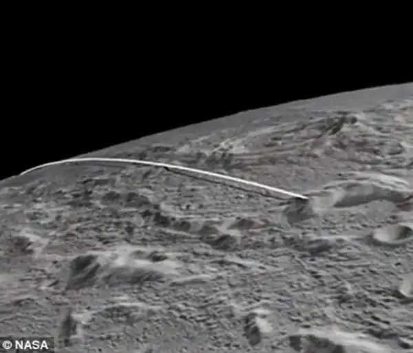Своеобразный сюрприз появляется на 56 секунде обнародованного НАСА фильма, составленного из ряда последовательных фото. Один из зондов пролетает над довольно внушительным объектом прямоугольной формы. По крайне мере так выглядит обращенная к наблюдателю часть конструкции. Она похожа на развалины, в которых сохранился фундамент. Снимает камера, установленная позади зонда, поэтому объект удаляется.