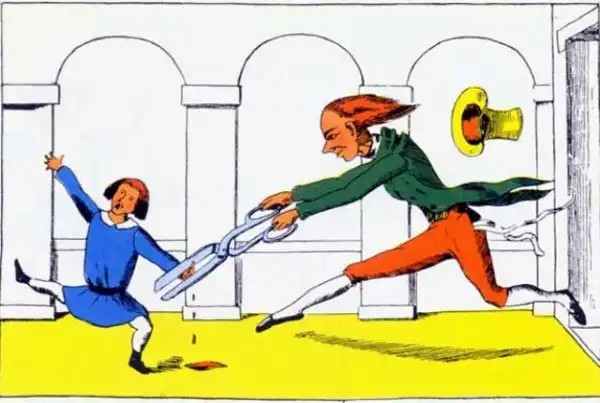 Мама Конрада, уходя по делам, строго-настрого запретила сыну сосать в её отсутствие палец. Ребёнок, разумеется, ослушался. И тогда пришёл портной и отстриг мальчику большие пальцы своими острыми ножницами: