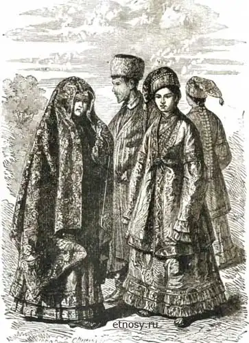 Москвичи (трое слева) и служилый татарин. Так, как моду до начала XVIII века в Восточной Европе диктовала Волжская Булгария, мы по этим костюмам можем судить об одежде булгар XVI-XVII вв. Из книги Д. Ровинского "Материалы для русской иконографии".