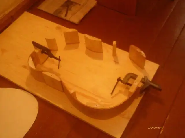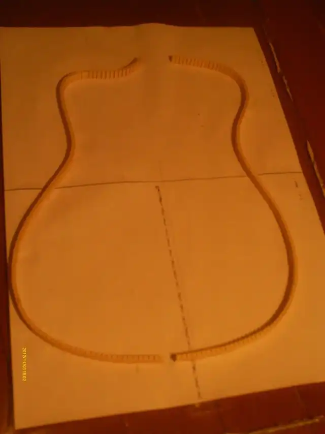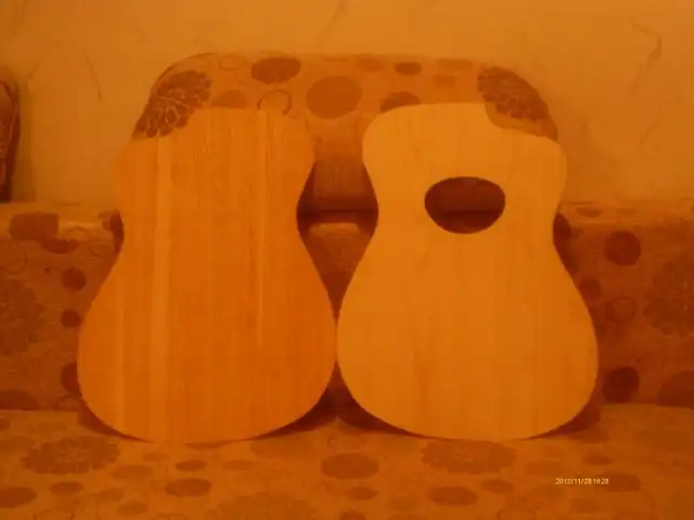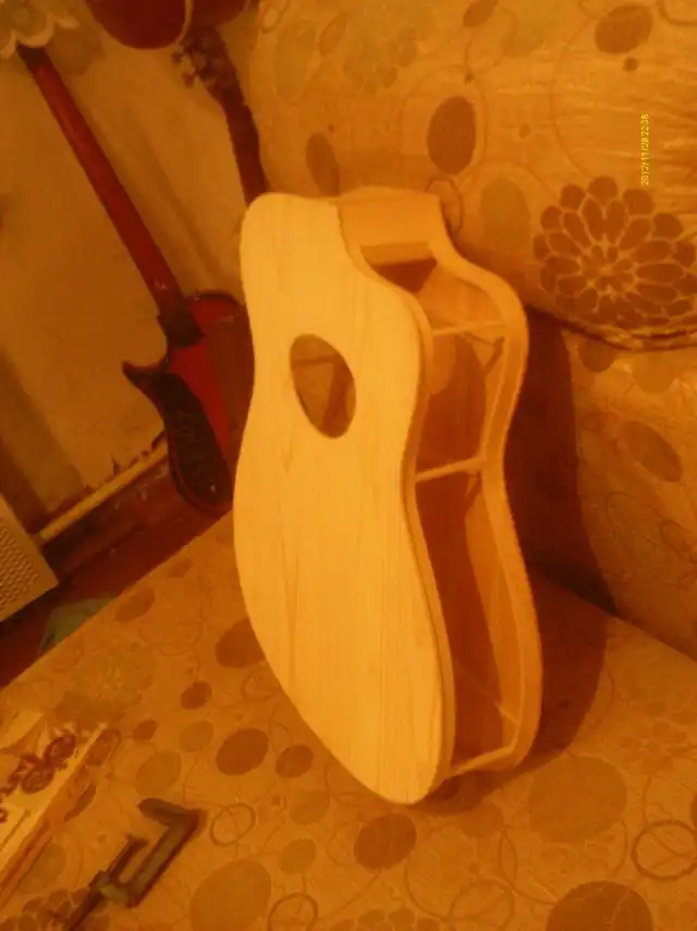 Склеил стык, заготовки дек, выпилил форму гитары. Наклеил пружины, контр-обечайки, и накладку усиливающую конструкцию гитары: