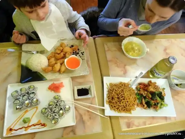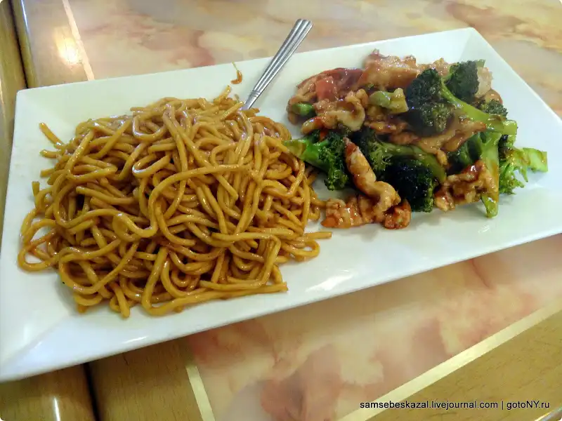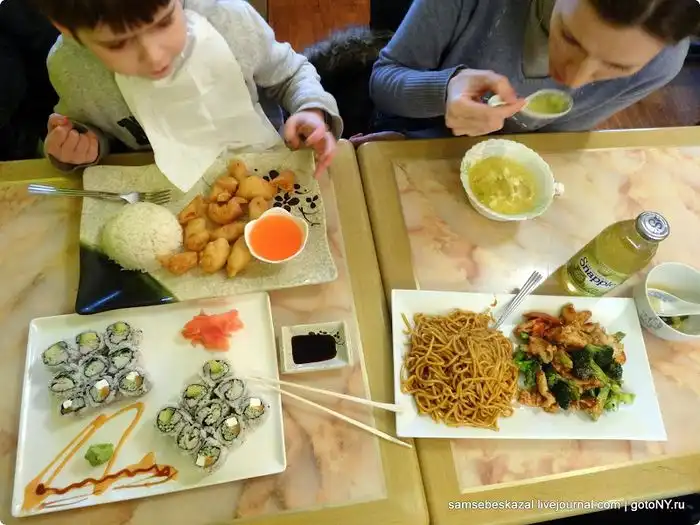 Это дешевый ресторан, который держат китайцы. Суши у них так себе, примерно как в ресторанах сети Евразия в Питере, а вот китайская еда очень даже. Хотя от китайского там одно название. Блюда давно адаптированы под американский вкус, и кухня официально именуется американо-китайской. В аутентичных китайских ресторанах такое не подают. На самом деле это довольно вкусно, и, в любом случае, гораздо лучше гамбургеров с картошкой фри. Мне по приезду в Нью-Йорк всегда первым делом хочется поесть именно такой еды. Живя в Питере я так и не смог найти ничего даже отдаленно похожего. На местной китайской кухне стоит остановится подробнее, но для этого надо сходить в уличный китайский ресторанчик, коих тысячи в Нью-Йорке, и купить еду на вынос. Если тема с едой покажется вам интересной, то я так и сделаю.