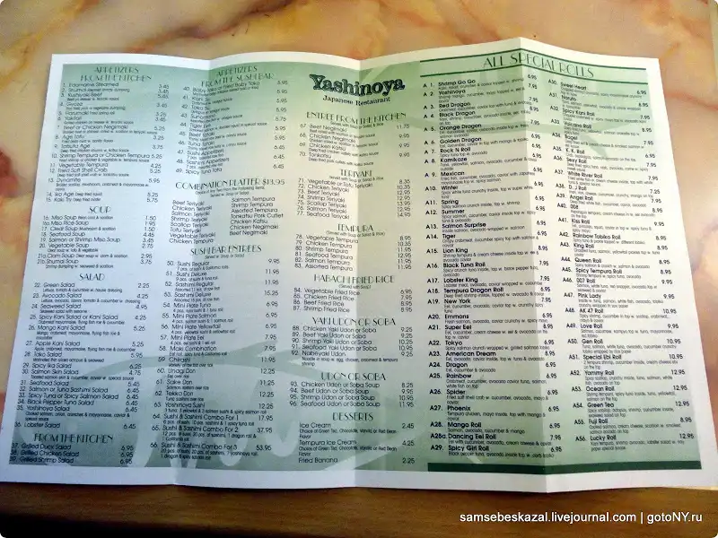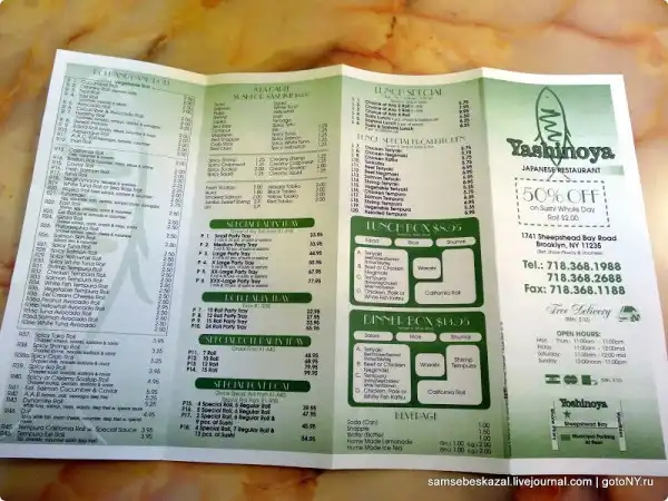 Меню ресторана с ценами для изучения. Одна сторона. Цены тут одни из самых низких в городе. Роллы идут всего по 2 доллара. На Манхеттене в бюджетном заведении они будут стоить уже $3-5. Но тоже очень зависит от места. Жизнь в Бруклине в отношении цен очень выгодно отличается от жизни на Манхеттене. И это касается не только ресторанов. При этом Бруклин дороже соседнего Нью-Джерси.