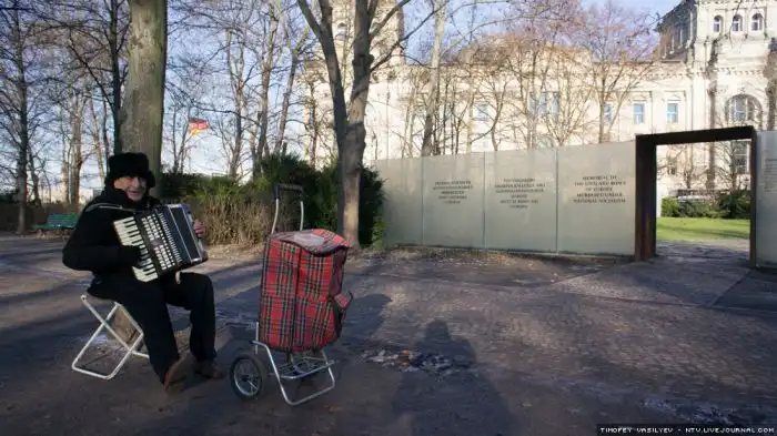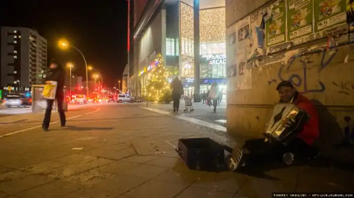 Очередной нищий играет на аккордеоне в пригороде Берлина.