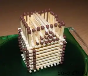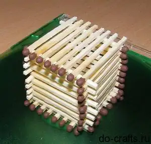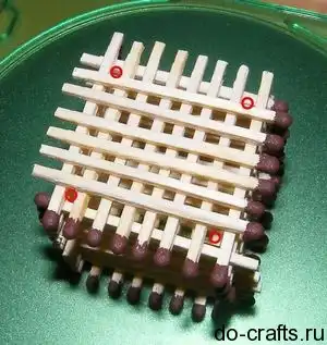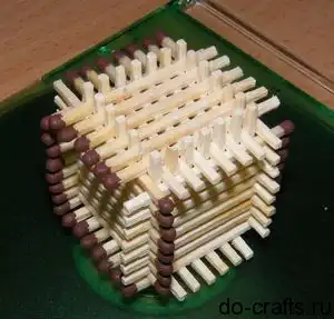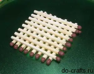 2-й шаг: наверх, не забывая использовать свой глазомер, кладем еще 8 спичек. При этом расстояние между спичками не должно превышать толщину самой спички. Перпендикулярно предыдущему слою улаживаем еще один слой из 8 спичек. Затем по краям основы выкладываем 4 спички и проделываем эту процедуру 6 раз.