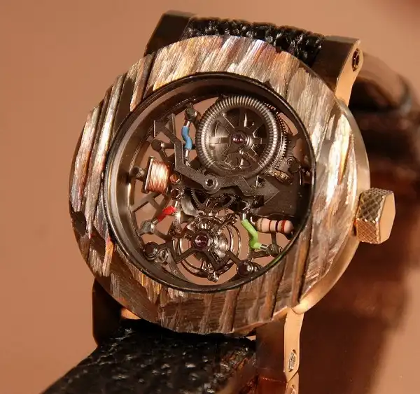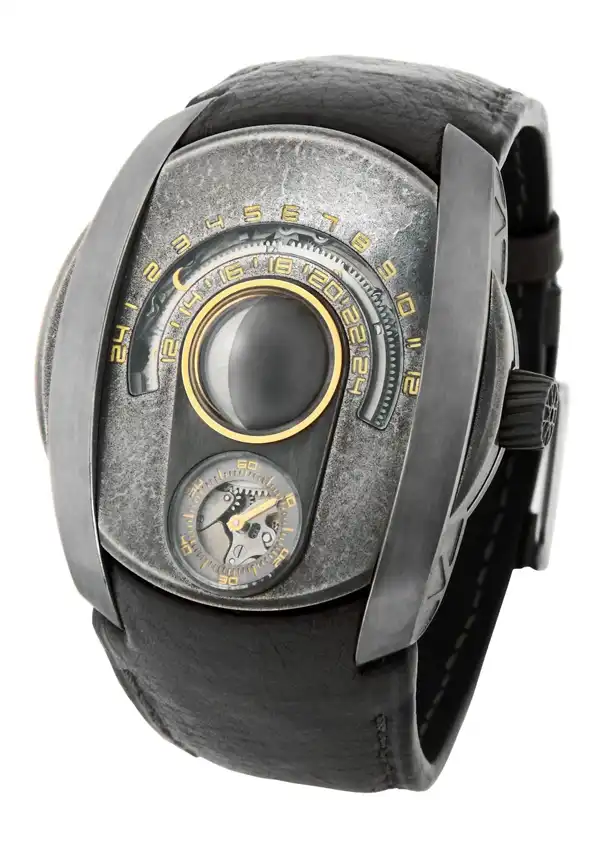 Эти часы стали воплощением концепции изобретательности, в которой объединились усилия трех наиболее известных разработчиков часов. Сборка частей отличалась невероятной оригинальностью – фактически, у часов вообще отсутствовал корпус в привычном его понимании! Циферблат и безель часов стали, по сути, частью механизма, у модели Freak отсутствовали заводная головка и стрелки, а часовой механизм, вращаясь, показывал время!