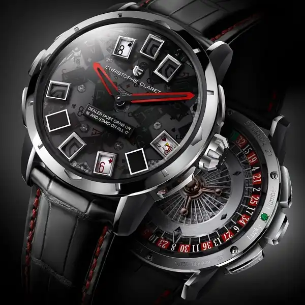 Классическая элегантность за шестизначную сумму выглядит очень лаконично и просто. Это самая настоящая игрушка для больших мальчиков, часы включают в себя три популярные игры казино – блэкджек, рулетку и кости. Блэкджек скрывается под сапфировым стеклом на циферблате, где представлены небольшие окошки в рамках, покрытых родием. Кости спрятаны в боковой части корпуса, в то время как рулетку можно найти в нижней части корпуса. Ремешок выполнен из крокодильей кожи, а корпус доступен на выбор из белого или розового золота, черного или серого сплава титана. Каждый из вариантов оформления часов выпускается ограниченным тиражом в количестве 21 единицы.