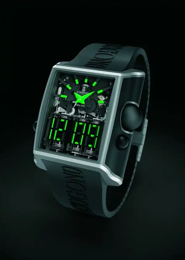 Это первые в мире механические часы одновременно с аналоговой и цифровой индикацией. Цифровая показывает время во втором часовом поясе. Механический дисплей модуля GMT практически не отличим от электронного.