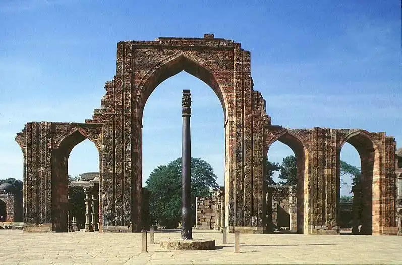 Колонна сделана из чистого железа, но практически не подвержена коррозии. Исследователи полагают, что дело в специфических климатических условиях Дели, благодаря которым на поверхности монумента образовалась особая пленка, защищающая его от разрушения. Опоясывающая колонну надпись на санскрите гласит, что она была поставлена в честь победы царя Чандрагупты над народами Средней Азии.