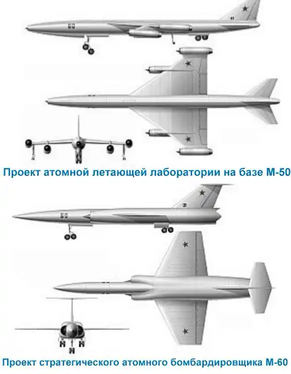 Первые разработки советской программы атомолетов начались с 1952 г, вместо прямоточного реактивного двигателя на керосине на первую межконинентальную ракету "Буря" предлагалось установить небольшой ядерный реактор. Но в 1960 году "Буря" была закрыта из-за смерти конструктора Лавочкина.