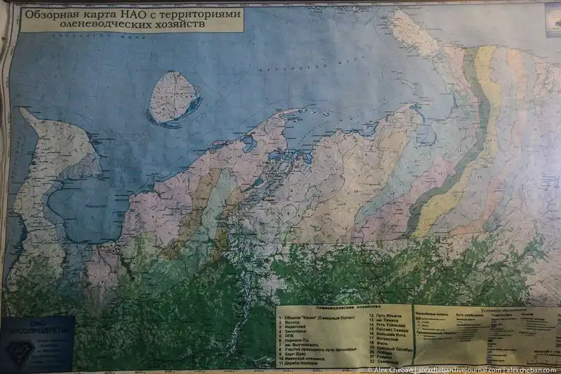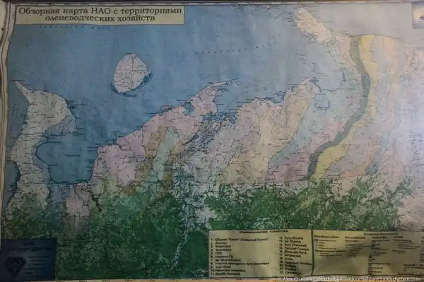 Техническое отступление: практически во всех помещениях предприятия освещение было недостаточным для качественной съемки, а вспышки у меня с собой не было, поэтому качество фотографий репортажное, а не ярко-резкое. Также баланс белого исправлять было невероятно сложно, а черно-белыми фотографии я не хотел делать. Начнем с самого начала… с технологии выпаса оленей. Это карта Ненецкого Автономного Округа. Вертикальное цветовое зонирование обозначает регион выпаса того или иного оленеводческого хозяйтсво в течении года. Оленей нельзя держать на ферме, обязателен именно кочевой образ жизни. Обычно группа из нескольких оленеводов (5-15) ставит чум на период 3-4нед - 1,5 месяца, вокруг которого пасутся олени, питаясь ягелем, который они откапывают даже из под снега. Когда запасы ягеля на этой территории оканчиваются - необходимо поменять локацию. Конечно же в процессе есть масса нюансов, но очень обобщенно промысел оленеводов выглядит именно так. Круглый год из года в год.