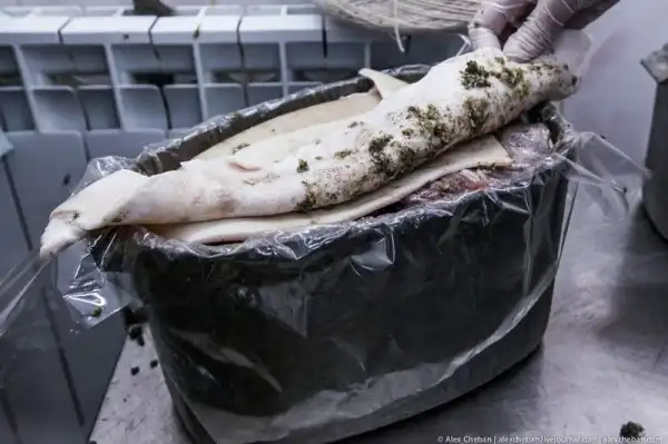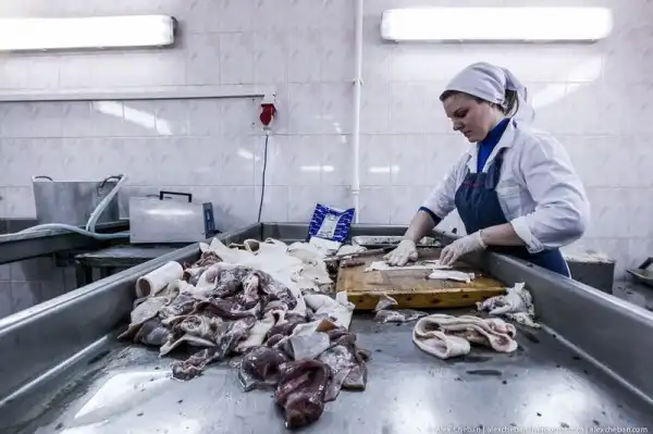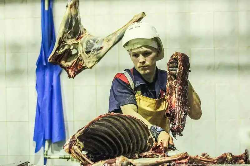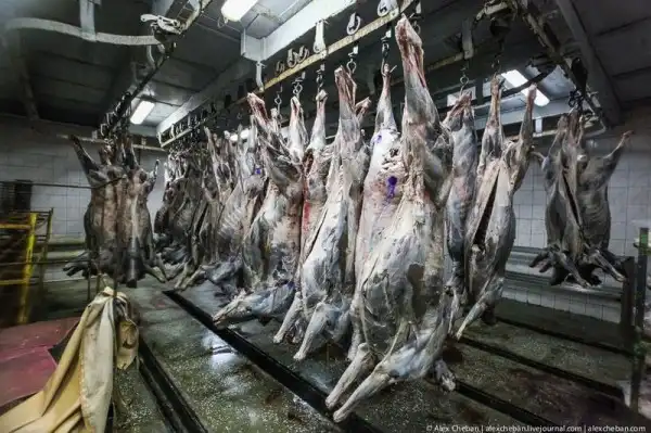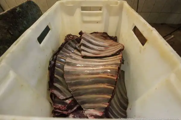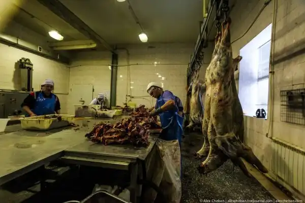 Далее туши транспортируются в обвалочный цех, где происходит разделка: Один сотрудник обвалочного цеха разделывает 35-45 туш, куда они транспортируются с помощью кранов. Средний вес 1 туши оленя - 30-35кг.