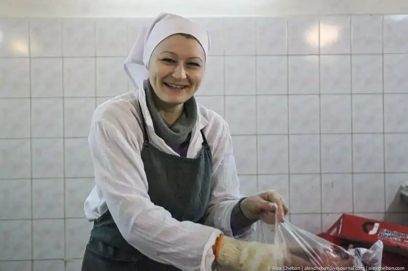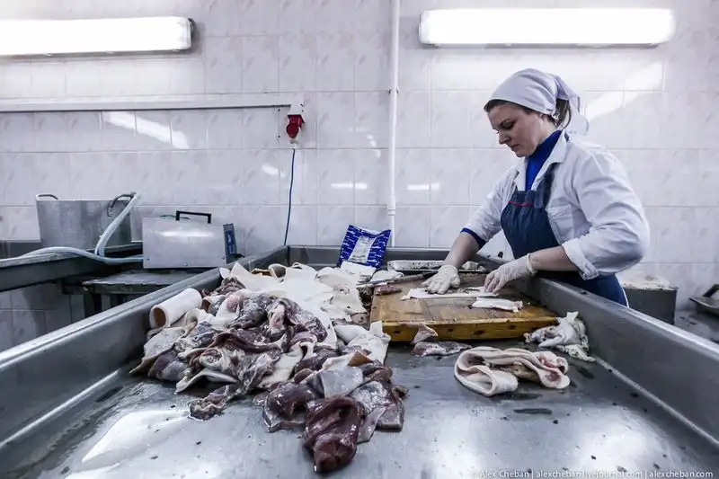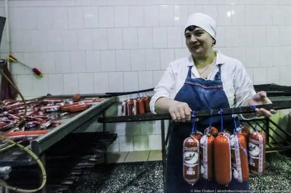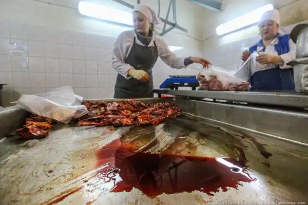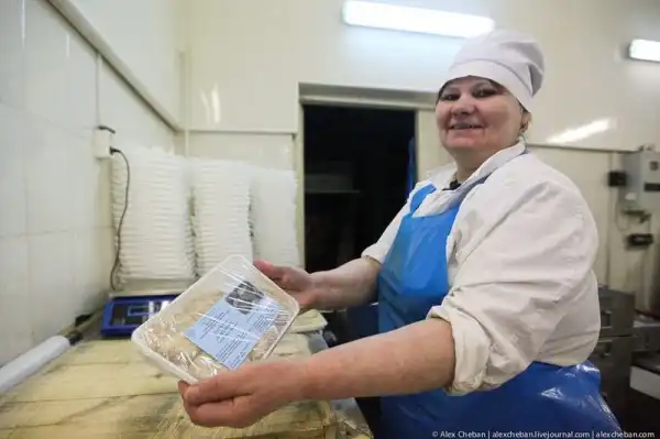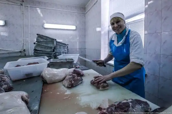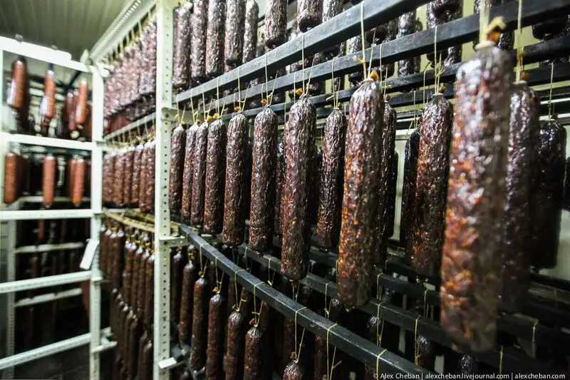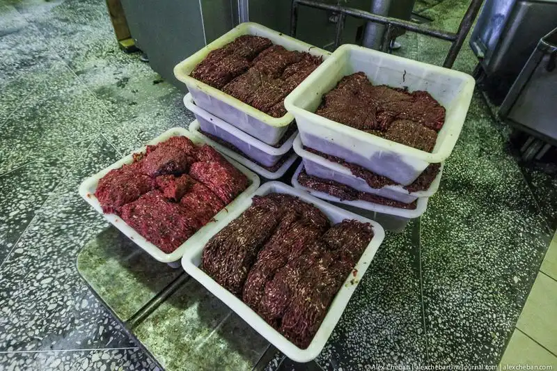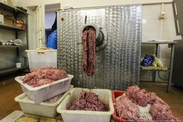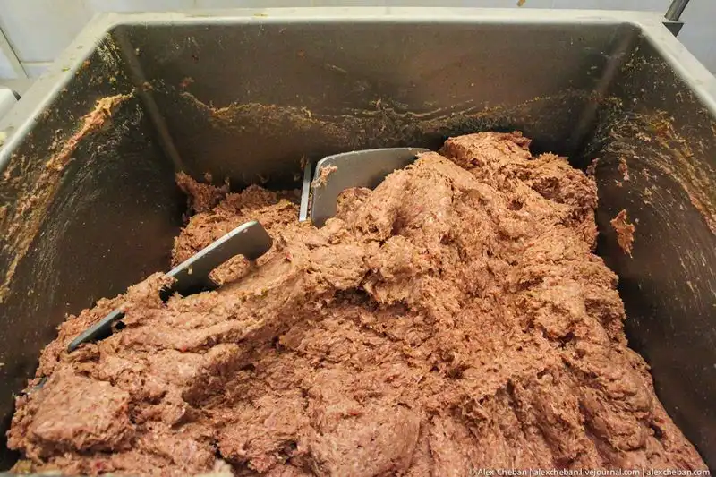 Теперь пройдемся по различным отделениям мясокомбината, ведь здесь производят 50 наименований продуктов! Колбасное отделение: Для производства колбасы тут используется фарш из: оленины - до 80%, свинины (сало) - от 15%, соя - до 5%. Колбаса не может быть только из оленины, так как она будет жесткой и невкусной. Но, главное, колбаса здесь действительно из настоящего мяса! Свинины и говядины завозится 400 тонн в год из центральных регионов России, из которой мясокомбинат производит как самостоятельные продукты, так и в дополнение к оленине в колбасы.