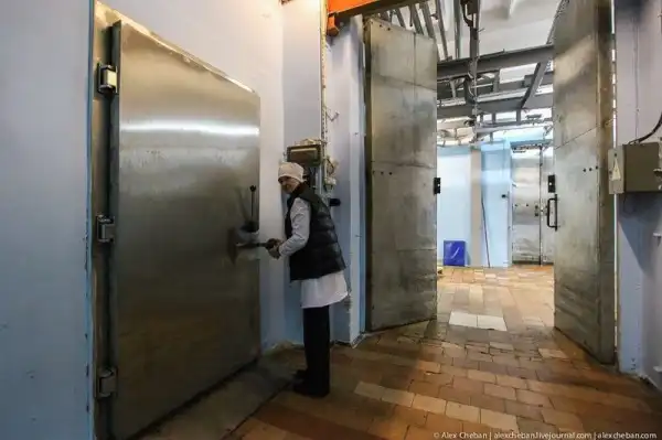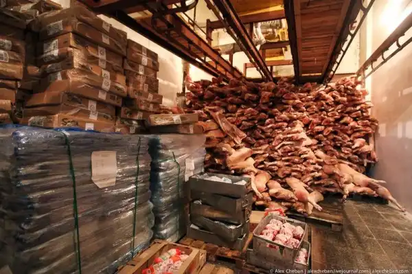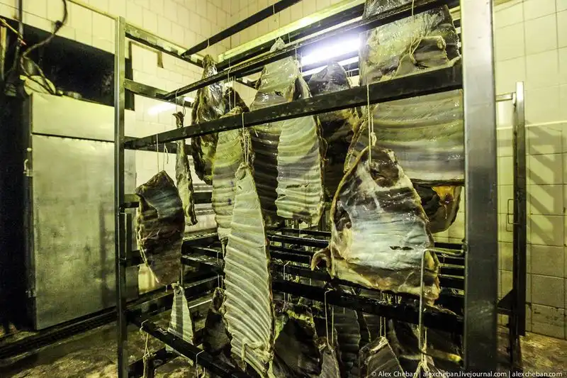 На мясокомбинате туши хранятся в морозильных камерах при температуре -18. Собственно в зимний период происходит накопление исходного сырья на весь год работы.