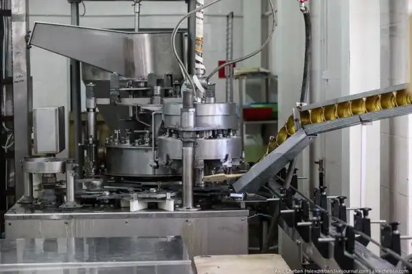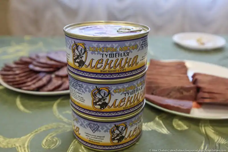 Консервы "Оленина тушеная": Состоит из натуральных кусков оленьего мяса, специй, трав, соли и перца, и жира. Мясная смесь для приготовление тушенки - только свеже обвалено и жилованое (удаление крупных жил, хрящей и кровеносных сосудов), процесс приготовления которого идет утром в обвалочном и колбасном отделениях. А процесс приготовления самих консервов начинается в 14.00. Мясная смесь и остальные ингридиенты загружаются в банки, закатывается тут: